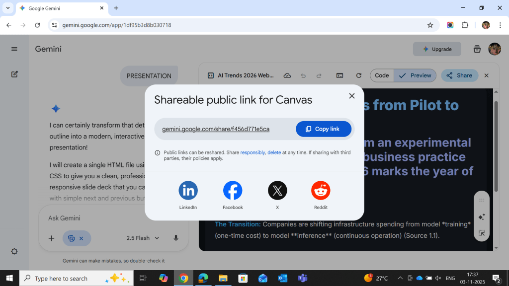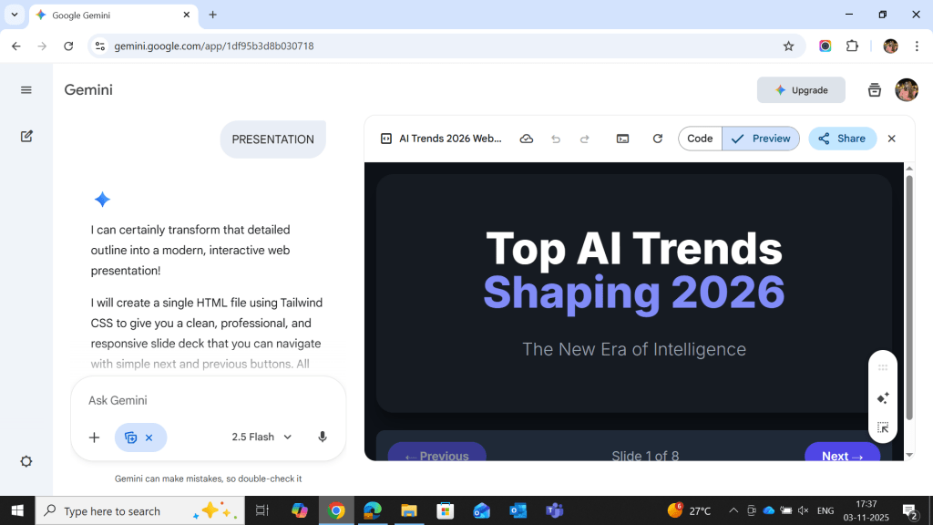 To make Gemini presentations that stand out, use Google Gemini Canvas along with its presentation features. This combination helps with design, content structure, and collaboration, reducing the time needed for creating professional results. The tool also integrates well with Google Slides automation, making editing and sharing easy.