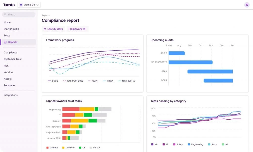 Vanta is a compliance automation platform that works quietly in the background and keeps an eye on your systems all the time. It’s designed for speed, helping you move from zero to audit-ready without chaos. The platform brings compliance, monitoring, and audits into one clean workspace.