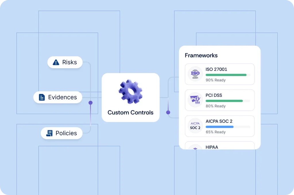 • Work across 35+ security and privacy frameworks like SOC 2, ISO 27001, and HIPAA, and even customize frameworks if needed.