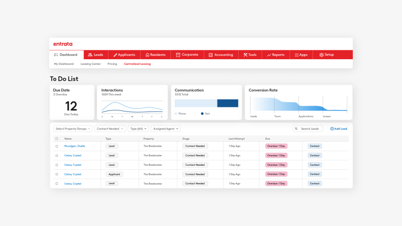 Entrata is a comprehensive AI property management software designed for large property portfolios and enterprise-level operations. It lets you handle more complex portfolios efficiently.